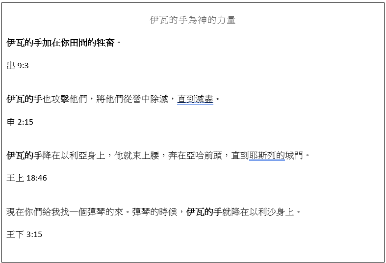 在整個舊約中,「伊瓦的手」都是描述神的力量/能力。