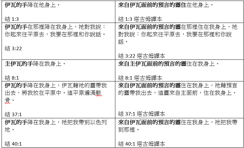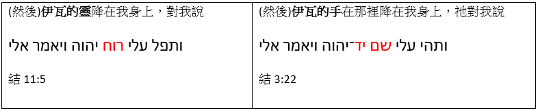 在第3章,以西結說「靈」將他舉起,然後在第22節,他說:「伊瓦的手在那裡降在我身上,祂對我說:『你起來往平原去,我要在那裡和你說話。』」